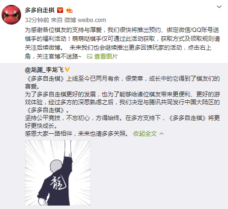 龙渊将与腾讯共同发行《多多自走棋》将推出预约,来自龙渊网络CEO李龙飞和《多多自走棋》官方的最新消息,腾讯将与龙渊共同发行中国大陆区的《多多自走棋》(注:这个是手游版本)。李龙飞微博原文:《多多自走棋》上线至今已两月有余,很荣幸,成长中的它得到了棋友们的喜爱。为了多...