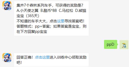 跑跑卡丁车手游集齐7个森林系列车手,可获得的奖励是?,跑跑卡丁车手游微信7月3日的题目是:集齐7个森林系列的车手,可以获得奖励是什么?这个问题很多玩家不知道,因为根本没有攒起这么多角色,下面让小编来告诉大家。跑跑卡丁车官方竞速版7月3日跑会答题题目:集齐7个森林系列车手,可...