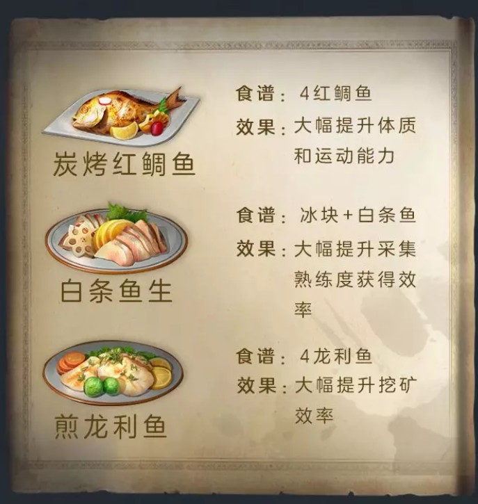 明日之后鱼类食谱大全:鱼类食谱配方一览,明日之后鱼类食谱的配方是什么?这款游戏既然有钓鱼的玩法,这些鱼也是可以制作成美食的,不过需要的是有完善的食谱才行,这次小编将为大家分享鱼类的食谱配方,下面就是本次要为大家带的攻略详情,各位可以看看。11种鱼类食谱与效果一...