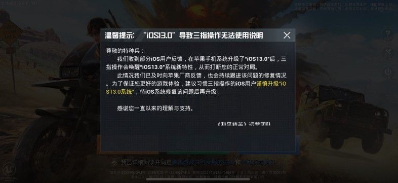 和平精英IOS13三指无法操使用?ios13三指操作无法用官方公告[图],和平精英前段时间更新之后,游戏就出现了很多问题,最为严重的就是IOS13系统的用户,在游戏中无法三指操作,而且官方还发出了公告,下面一起来看看解决方法。ios13三指操作无法用官方公告iOS可以更新到iOS13.0系统,...