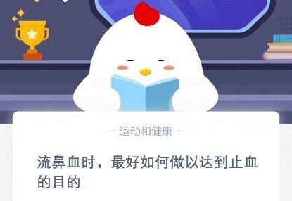 流鼻血时最好如何做以达到止血的目的?11月26日蚂蚁庄园今日答案最新,今天的小鸡宝宝考大家的题目是流鼻血时最好如何做以达到止血的目的?大家影响中的止鼻血的方法是头抬起、或者直接用纸堵住鼻孔,殊不知这样的危害非常到,如果流的鼻血过多这样会让血回流到喉咙严重会让人休克。流鼻血时,最好如何做以达...