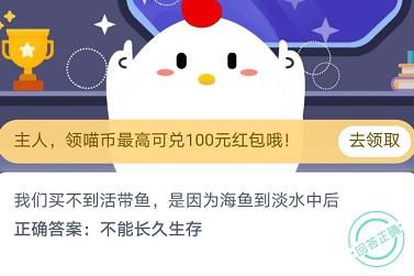 我们买不到活带鱼是因为海鱼到淡水中后?11月9日蚂蚁庄园今日答案,蚂蚁庄园11月9日的问题是为什么买不到活带鱼,这个问题的答案和原因下面都会有介绍,在购买带鱼的时候大家一般都是买的冰冻过的,至于活的带鱼为什么买不到,下面会有正确答案分析,让大家快速掌握答案哦!支付宝11月9日蚂蚁庄园今...