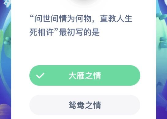问世间情为何物直教人生死相许最初写的是?蚂蚁庄园12.17答案,蚂蚁庄园问世间情为何物,直教人生死相许最初写的是什么?想要领取小鸡饲料的小伙伴,庄园小课堂大家是一定不能错过的,在这里天天都可以进行答题领饲料,而且每次的问题都非常简单,不过偶尔会出现一些比较冷门的知识,不知道答案也没关...