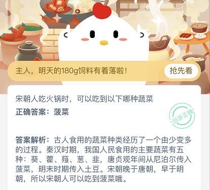 宋朝人吃火锅可以吃到土豆还是菠菜 宋朝人吃火锅时可以吃到土豆吗,蚂蚁庄园宋朝人吃火锅时,可以吃到以下哪种蔬菜?玩家们一直在寻找这个问题的答案,支付宝的蚂蚁庄园中每天都可以通过答题得到一份饲料,答题的题目难度一般都不会特别大,所以想要获得饲料还是很简单的,今天的答案本站小编会带给大家...