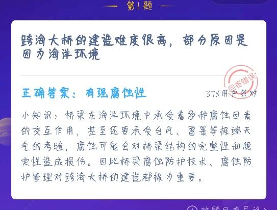 跨海大桥的建造难度很高,部分原因是因为海洋环境的什么 蚂蚁庄园12月24日答案,蚂蚁庄园跨海大桥为什么建造的难度那么高?这是因为海洋中什么环境导致的?12月24号的问题可以赶紧了解,得知正确的答案才可以领到180克小鸡饲料,经常关注庄园小课堂的用户一定要赶紧多了解一下,下面就是本站小编准备的攻略。...
