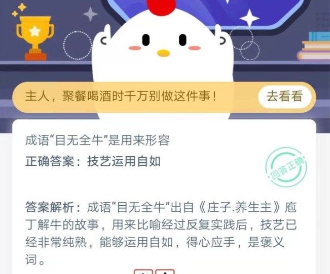 成语目无全牛指的是 成语目无全牛形容的是什么蚂蚁庄园,目无全牛是褒义词还是贬义词?今天的小鸡宝宝给大家出的题目是问大家目无全牛这个成语是用来形容人怎么样呢?这个成语在我们的中学课本都有学过,而且这个成语的出处就在我们学习的文章之中。下面就来告诉大家答案。蚂蚁庄园12月27日...