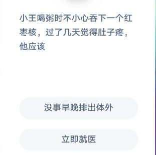 小王喝粥时不小心吞下一个红枣核,过了几天觉得肚子疼,他应该怎么办,蚂蚁庄园今日答案12.4,小王喝粥时不小心吞下一个红枣核,过了几天觉得肚子疼,他应该怎么办?这是蚂蚁庄园上面的一道关于生活日常的题目,很多小伙伴们在生活中遇到这种情况往往会手忙脚乱,不知道怎么办,下面就来跟大家说说这个日常生活中应该具备的小技巧,...