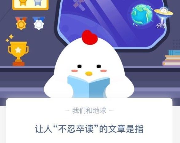 不忍卒读的文章是指 不忍卒读是指蚂蚁庄园,蚂蚁庄园不忍卒读的文章是指什么?不忍卒读讲述的是什么内容?玩家们对此问题一直很纠结,主要是不知道不忍卒读的含义,所以本站小编今天就会将不忍卒读的意思和这个题目的答案详解分享在下面,供大家参考。蚂蚁庄园不忍卒读是指问题答...