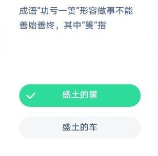 成语功亏一篑形容做事不能善始善终其中篑指?蚂蚁庄园12月5日答案,成语“功亏一篑”形容做事不能善始善终其中篑指什么?这是蚂蚁庄园2020年12月5日的题目,不知道各位宝宝们选了哪个答案呢?对于这个成语大家有没有正确的理解?和小编一起来看看本次的答案及解析吧!题目:成语功亏一篑形容做事不...