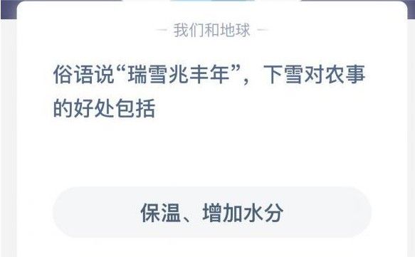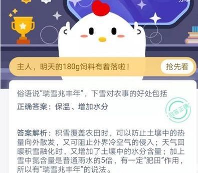蚂蚁庄园瑞雪兆丰年 蚂蚁庄园瑞雪兆丰年最新答案,蚂蚁庄园瑞雪兆丰年如何选择答案?下雪天对于农事是有好处的,但是具体的好处大家知道吗?想要知道这道题答案的玩家,小编会在下面为大家准备详细的答案解析,想要知道选择什么的玩家可以和小编一起来了解下。蚂蚁庄园瑞雪兆丰年最新答案...