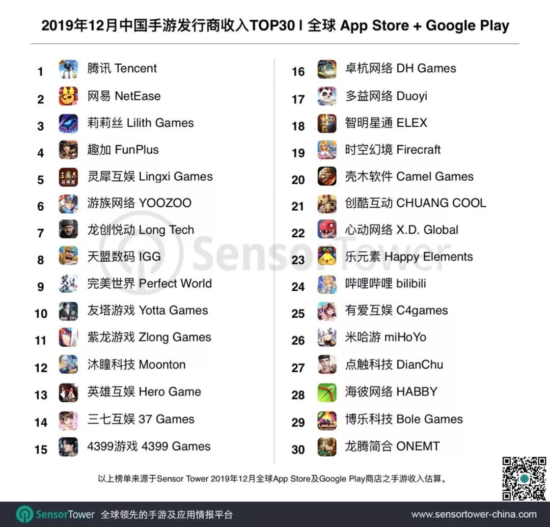 2019年12月中国手游发行商全球收入排行:腾讯、网易、莉莉丝位列前三,2019年12月中国手游发行商全球收入怎么样?喜欢玩游戏的大家应该都对中国手游发行商的收入感兴趣吧,一般游戏约火,发行商收入越高,其中就有手机最火的吃鸡游戏-腾讯的和平精英,很多小伙伴应该都不清楚中国手游发行商在全球的收...