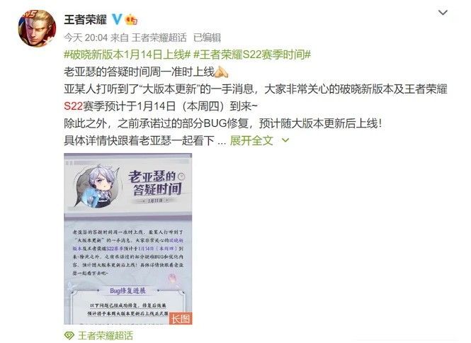 王者荣耀s22更新时间 1月14日几点更新s22赛季,王者荣耀s22更新时间已经确定,新赛季会在1月14日正式开启,今天是不会更新新赛季的,玩家们要等到明天才会正式上线,破晓新版本的更新时间最新消息本站小编会在下面为大家分享,玩家们也能提前先看一看。王者荣耀s22更新时间...