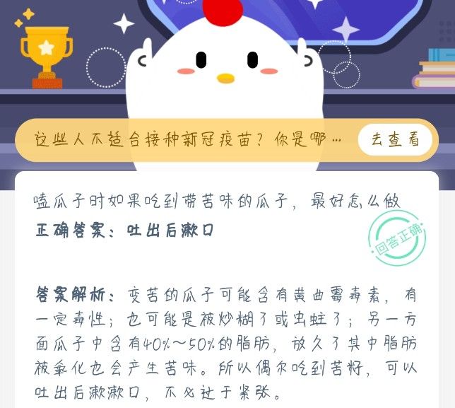 嗑瓜子时如果吃到带苦味的瓜子蚂蚁庄园答案,蚂蚁庄园吃到苦味的瓜子要不要吞下去?嗑瓜子的时候经常会吃到有苦味的瓜子,这种瓜子就是大家经常所说的坏瓜子,但是很多人吃到嘴巴里是直接吞下去了,能不能直接吃掉呢?正确答案可以看一看本站小编带来的攻略。嗑瓜子时如果吃到带苦...