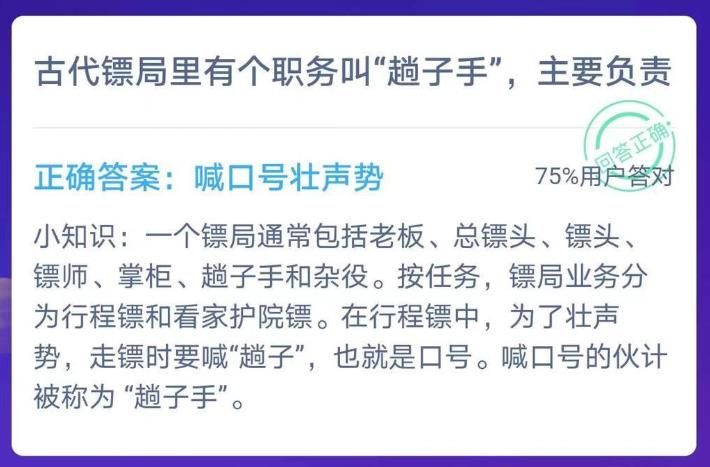蚂蚁庄园古代镖局趟子手 蚂蚁庄园今日答案古代镖局趟子手,蚂蚁庄园古代镖局趟子手是干什么的?趟子手其实是古代镖局的一个职业,但是现在有很多人已经不知道这个职业具体指的是哪一个了,本站小编今天这个问题的正确答案分享在下方,有兴趣就一起来了解一下吧。蚂蚁庄园每日答案大全(每天更新...