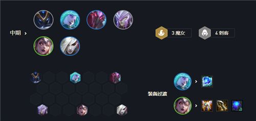 中期则把打工的酒桶和狼人换下去,上阵莫甘娜和冰女与妖姬组成3魔女羁绊,并且搜出妖姬的三星,再加入卡特琳娜和魔腾,组成了4刺客羁绊,装备给拉特琳娜来打工。后期升到8人口后,去搜5费的佛耶戈和狗熊,再用佛耶戈和皎月换掉卡特琳娜和螳螂,阵容即可成型。