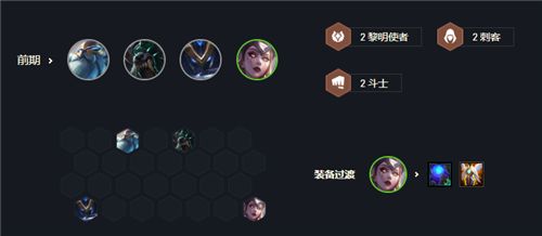开局选秀优先拿黑暗眼泪、眼泪或大剑,用来合成妖姬的蓝霸符和复活甲,前期的过渡可以用酒桶、狼人、螳螂和皎月,可以组成2黎明使者、2刺客和2斗士羁绊,狼人的技能有治疗效果,是非常不错的打工卡。