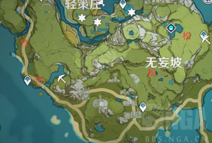 松木主要通过砍伐针叶树来获取,针叶树主要分布在璃月地区,尤其是无妄坡这个地方比较多,详细位置如上图所示。