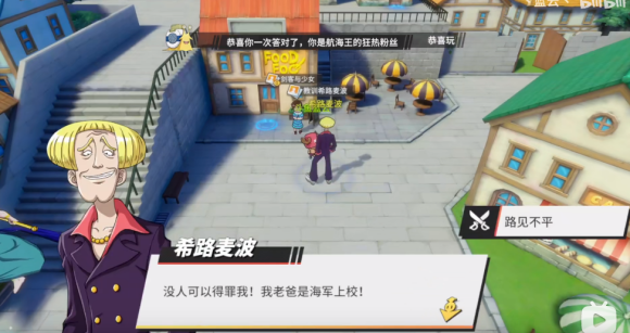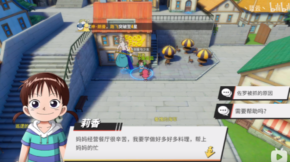 三:找小女孩对话,然后买鱼,鱼在旁边摊位;拿到鱼给小女孩,顺便选索隆被抓原因,拍照选索隆照片;