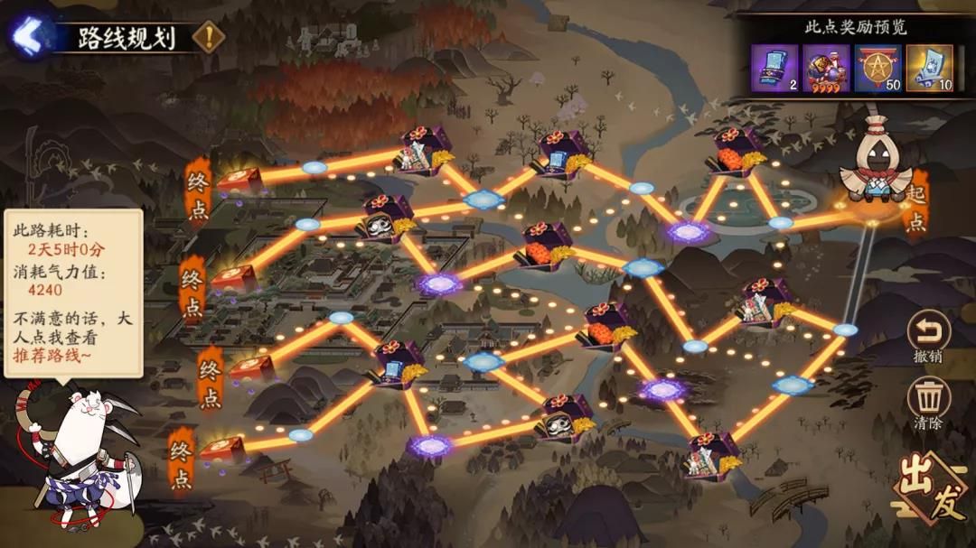 点击地图上各位置点可查看清扫此处需要消耗的时间与气力值以及完成清扫的奖励,并为帚神设定具体的清扫路线