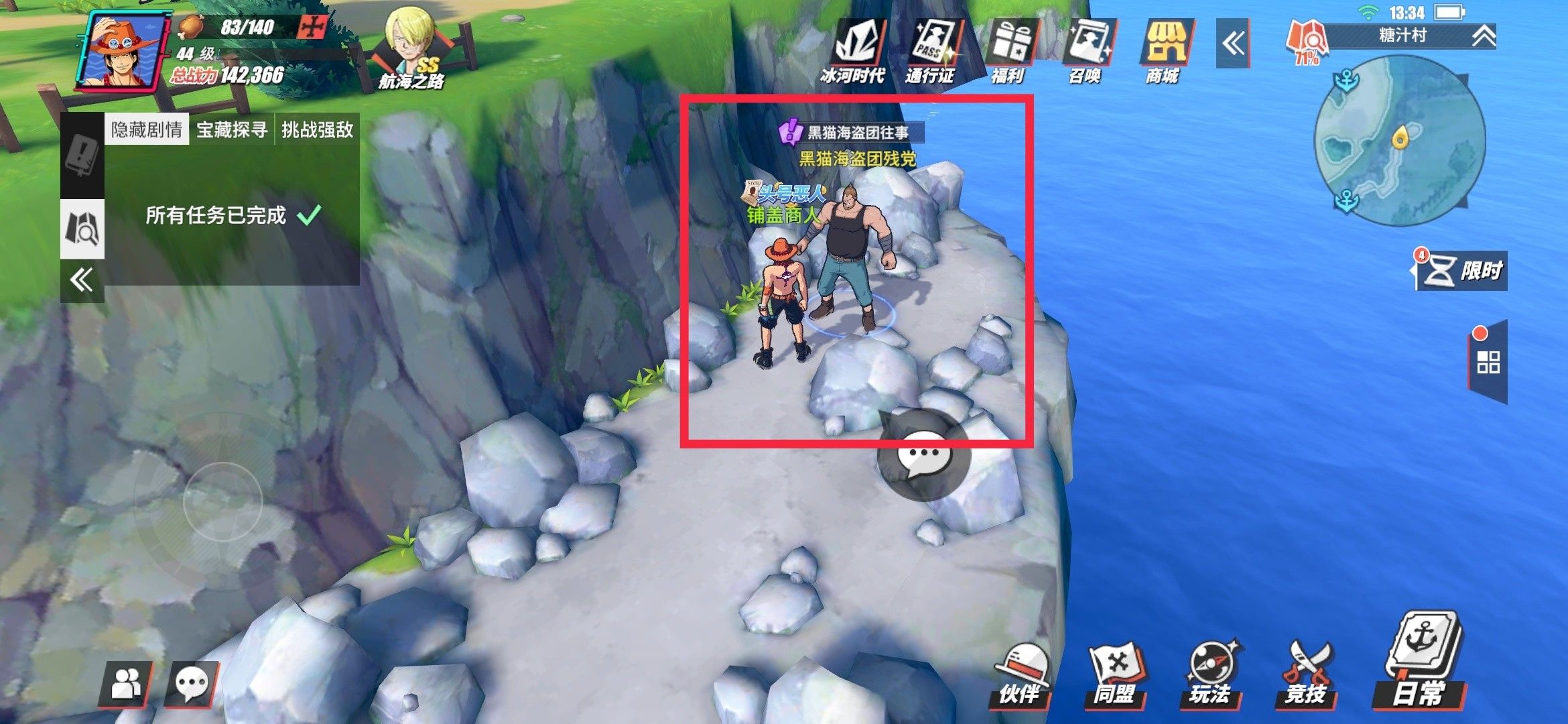 黑猫海盗团任务npc位置在糖汁村南海岸那边的碎石滩,如图,对话就可以做任务了