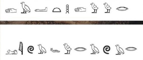 墓室中泄出的热气吹拂着蜡烛不断的摇曳映入眼帘的是金光闪闪的墙壁和装饰,奇怪的国王雕像通体乌黑、脚金质凉鞋、手持权杖和狼牙棒;嵌金的宝座上雕刻着狮头、哈索尔头和地狱中的野兽;黑色神龛里盘着镶金的盘蛇;卡特仔细的环视四周,不想放过任间一个细小的细节,毕竟每一个细节都是重大的发现。可在仔细的观察之后,他发现图坦卡蒙的棺椁似乎并不在这里,再次仔细的查证后,他在墓室中央的墙壁上发现了两扇非常隐蔽的墓门,门上还分别刻着奇怪的壁画,壁画如下: