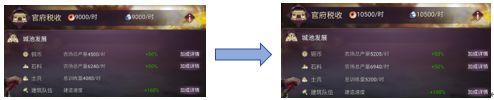 首日官府锁定在19级,按正常进度,四天能到27级。上图可以看到,官府等级上去之后,城池的发展得到显著提升(如上图),24级官府晋升至27级官府后,建造速度和税收明显得到巨大改善。建造速度每升级一次,加10%,27级官府足足比24级官府提高了1、2倍的建造速度。