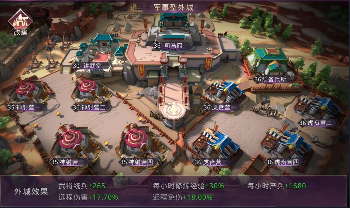 外城都选择军事外城,前期不会缺少资源,经济外城留给小号吧。外城的虎贲和神射因为基础属性低,所以加成低,主要用来提升主城繁荣度。司马府升到能开启第二层虎贲和神射即可,重点是保持讲武堂和司马府同级别,低一点也行(武将修炼经验加成),预备兵所提升到极限为止,防止攻击野外势力过多,导致兵力不足。