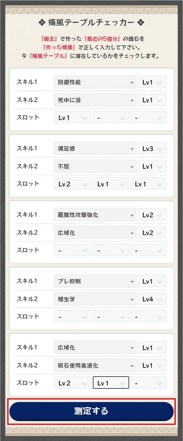 根据日本玩家整理出来的结果,发现幽玄炼金产生「弱点特效(痛击珠)2、风压耐性2,无装饰品槽」护石,取痛击珠与风压珠的缩写,称为「痛风护石」。而进一步比对其他炼金结果,归纳此护石目前只有单一表单会产生,因此称之为痛风表单。玩家认为进入这张表单的炼金术,即使炼金超过500次,不会有更好的护石产生,因此令人害怕,关键字tag「痛风テーブル」更一度上到了日本推特趋势