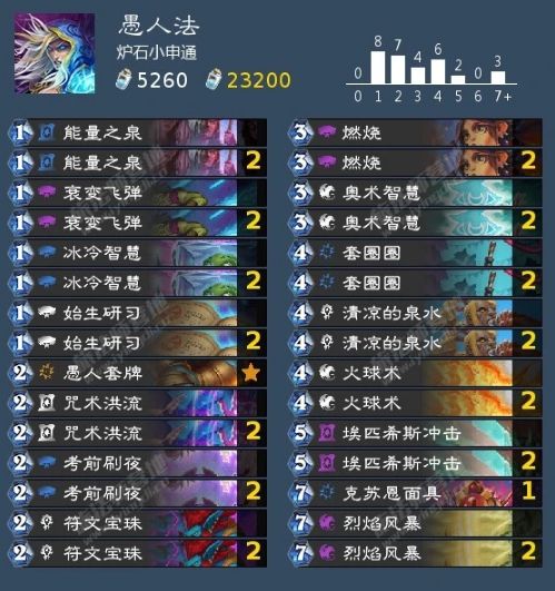 这套法师比较随机非常有意思,玩家通过过牌拿到愚人套牌,因为现在卡池比较浅,而高费法术质量很高,所以玩家大概率能够在低费回合打出高费法术,非常强。