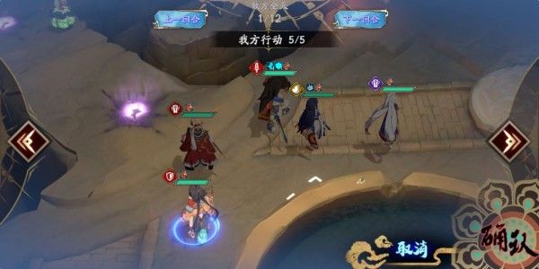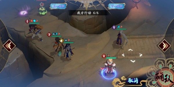 第2回合。韩无砂原地击杀残血雷小怪,白菀向上2格治疗殷剑平,殷剑平走到buff地块普攻击杀雷小怪,然后向左1格等待,依依走到殷剑平下方等待,夏侯仪离开依依和殷剑平的2格范围。敌动阶段,aoe放给殷剑平和依依,1只小怪普攻依依,依依需要抗住(如果被击杀则重开)。