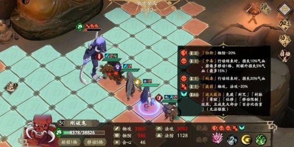第8回合。依依走到BOSS下方3格放誓死,殷剑平走到BOSS下方补血刃普攻,韩无砂原地普攻(被依依护卫),白菀原地治疗依依并加地御。敌动阶段,BOSS必定选择韩无砂,依依护卫。回合结束时,BOSS剩余血量6268。