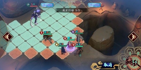第5回合。依依放誓死加缚力,殷剑平后退,白菀上前治疗殷剑平,韩无砂向上走3格进入范围,夏侯仪上前放离火。敌动阶段,BOSS必定选择攻击韩无砂,依依护卫。