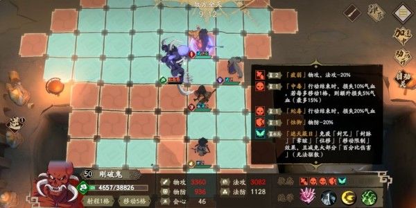 第9回合。白菀向下治疗依依并加地御,依依向上走(确保护卫韩无砂),韩无砂向右走1格放怖畏,殷剑平走到韩无砂之前位置普攻(我的殷剑平暴击直接击杀了,如果没有暴击,敌动阶段的毒伤也可以带走)。