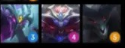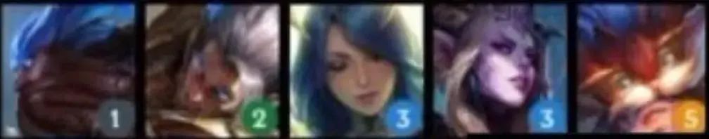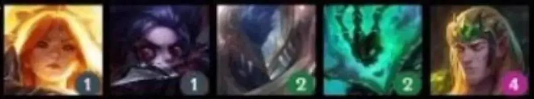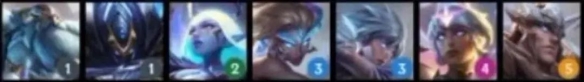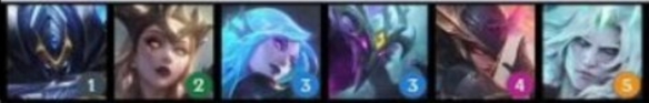 从左到右英雄:亚托克斯(1)、蕾欧娜(1)、辛德拉(1)、韦鲁斯(2)、拉克丝(3)、芮尔(4)、维克兹(4)、凯尔(5)