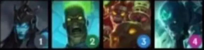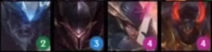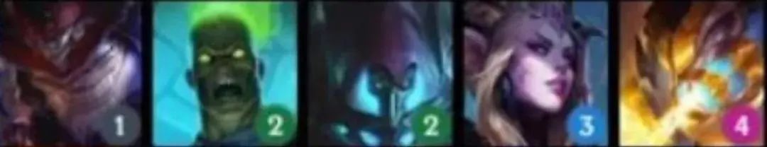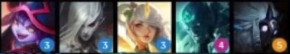从左到右英雄:卡兹克(1)、乐芙兰(2)、卡特琳娜(3)、梦魇(3)、黛安娜(4)、佛耶戈(5)