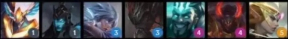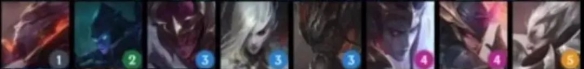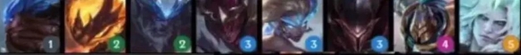从左到右英雄分别为:弗拉基米尔(1),瑟庄妮(2),李青(3),莫甘娜(3),亚索(3),厄斐琉斯(4),黛安娜(4),德莱厄斯(5)