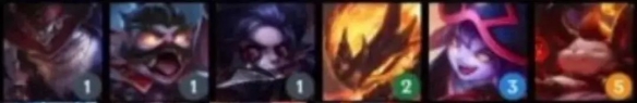 从左到右英雄:吉格斯(1)、克烈(1)、波比(1)、凯南(2)、璐璐(3)、提莫(5)