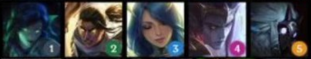 从左到右英雄:薇恩(1)、韦鲁斯(2)、艾希(3)、厄斐琉斯(4)、千珏(5)