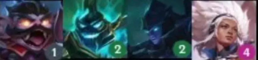 从左到右英雄:辛德拉(2)、艾翁(4)、卡尔玛(4)、提莫(5)