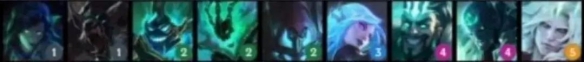 从左到右英雄分别为:薇恩(1)、沃里克(1)、赫卡里姆(2)、锤石(2)、维克多(2)、卡特琳娜(3)、德莱文(4)、瑞兹(4)、佛耶戈(5)。