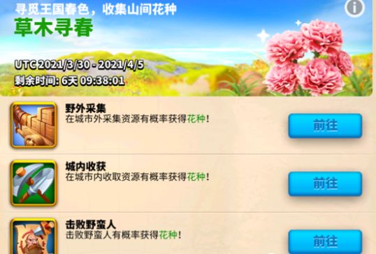 通过野外采集、城内收获、击败野蛮人可以获得花种