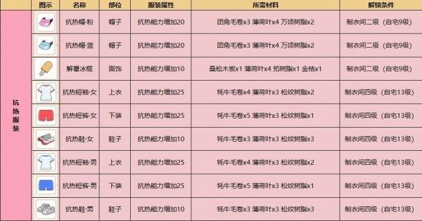 首先抗热短袖是【制衣间4级】解锁的一种服饰,需要用到【5个水玉貂毛】,注意准备好【百草饲料】,因为这属于特产材料,不是普通饲料可以喂出来的。其他木板之类的材料,都比较好采集。