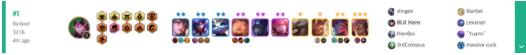 后期最强,体系内可挂五费卡非常多,天使吃装备,阵容吃整体质量,有肉装的瞎子是另一个大C,大成谁都能打,同等质量被龙王克制但是好打重装拉夫,站位不好不带沙皇可能会被神装的蛮王切死,但大多数蛮王不带水银,拉个慎下去就可以完美解决,阵容强度非常可观,除了运营难度较大别无缺点。