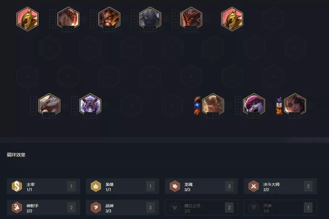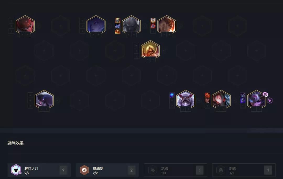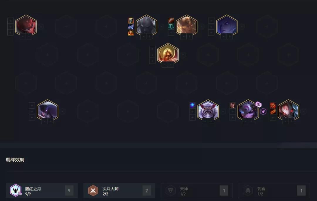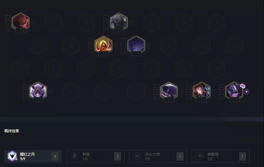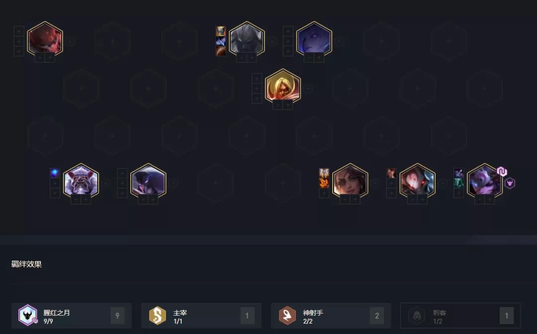 如果在对局中白嫖腥红天选,且腥红棋子比较多,装备上不算太差(有反曲),就可直接考虑这套阵容,腥红在这版本前中期属于强势阵容,特别是凑上6腥红羁绊后,可最少稳血到4-3左右。