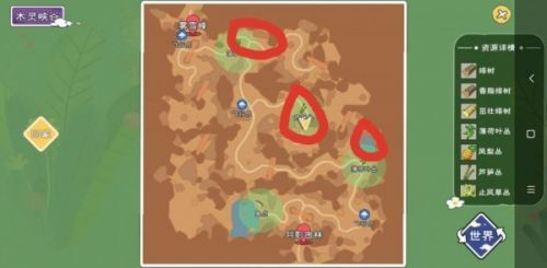 月影其实是没有隐藏地点的.他的稀有物资全部在基础物资附近刷新.左上角红圈会在下雨刷新水括木两颗.如果非下雨天进入月影森林两个红圈的地方则是两只灰羊刷新