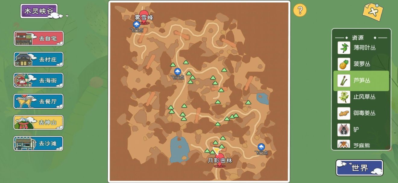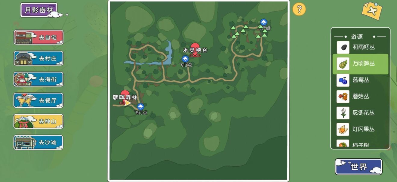 我们在这张地图上可以采集到:柠檬、柿子、蓝莓、蘑菇(夜晚刷新)、灯闪果(果丛附近随机刷新)、和雨籽、忍冬花(果丛附近随机刷新)、万顷笋。地图右边点开资源有分配。