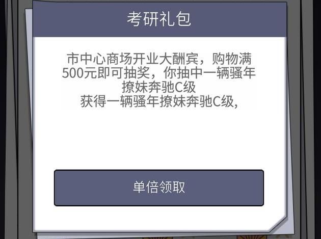 开局选择研究生开局(研究生的考试答案分别是CDB),生活类礼包,听说欧皇可以直接开到一处别墅,我这种非洲人只开到一辆奔驰车。