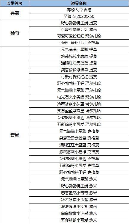 最主要的是,这次小蜜蜂的宝典最后还有31个盲盒,里面有随机奖励,范围涵盖了典藏、稀有或普通三种类别,根据官方的规则以及数据来看,首次开启盲盒会有0.1%概率触发典藏掉落,之后每次都会概率增加,自第21个盲盒起,触发的概率增加0.4%,当玩家开启所有31个盲盒时,必定会触发1次典藏掉落。