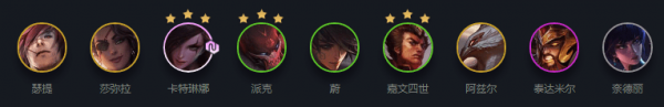 阵容搭配:瑟提、莎弥拉、卡特琳娜、派克、蔚、嘉文四世、阿兹尔、泰达米尔、奈德丽