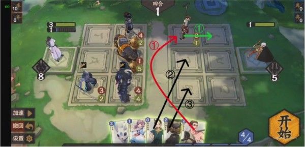 本关主要讲解嗜血与推位初步,思路与基础1-1差不多,防守中下路,利用上路进攻。其中上路对撞要求攻击大于2,中路防守要求血量大于1,下路要求血量大于4,可以得到以下解法: